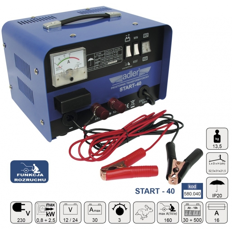 >WSZYSTKIE>PROSTOWNIKI>Adler Start-40 Prostownik transformatorowy 12 / 24 V z funkcją wspomagania rozruchu
